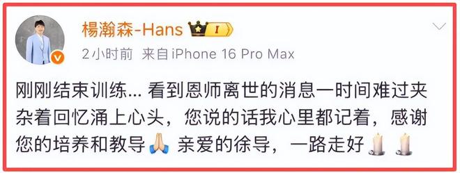 刚刚结束训练的杨瀚森第一时间得知噩耗,随即在社交媒体发文悼念:
