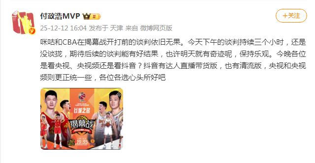 不过根据媒体人付政浩报道:淡定!这个《致球迷的信》是昨晚拟的,今天上午发出的,写的也是“暂未获得CBA新赛季版权”。而就在此时此刻,咪咕和CBA正在进行揭幕战开打前的最后一次谈判,双方都希望能弥合分歧、争取压哨签约。