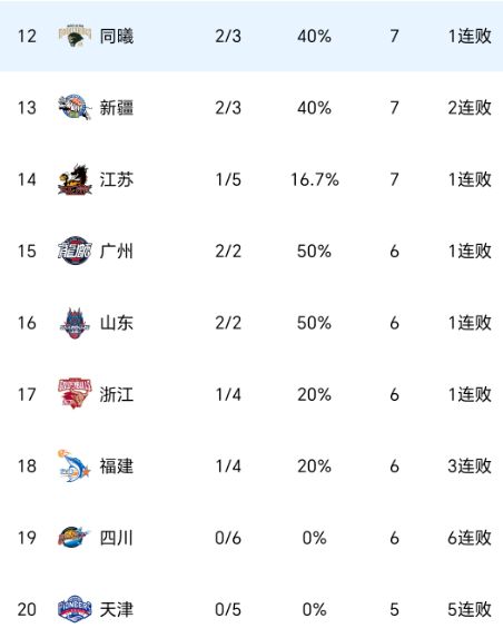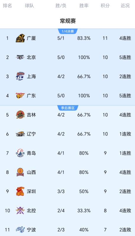 前五轮过后,只有北京队、广东队开局五连胜,青岛队、辽宁队、广厦队、山西队都是4胜1负战绩,另外天津队、四川队继续全败,未能收获一场胜利。
