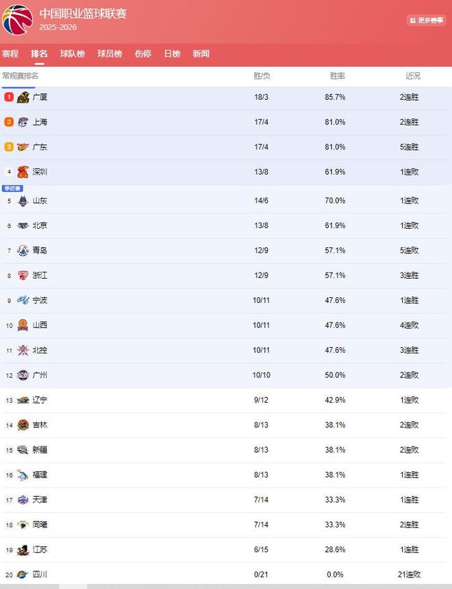 CBA最新排名: