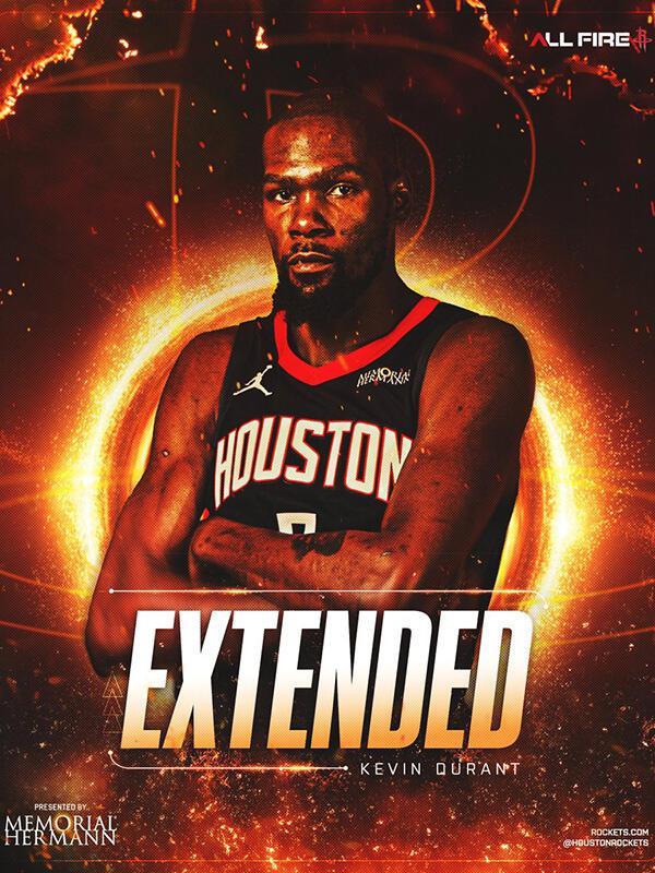 今年夏天,杜兰特通过NBA史上规模最大的七队交易加盟火箭。球队在今日的官宣续约公告中列举了他的一系列光荣履历——