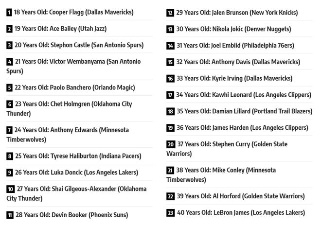 在常规赛即将开打之际,美媒《fadeawayworld》按照能力与状态公布NBA现役各年龄最佳球星名单,其中37岁库里击败杜兰特,独行侠3大状元齐入选。