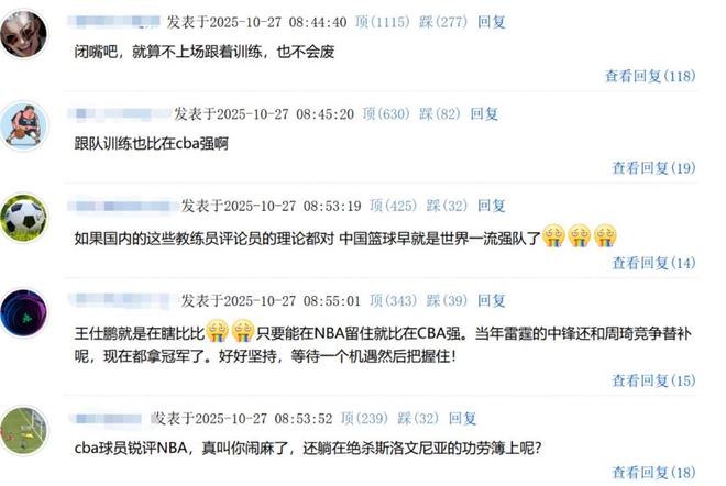 这句话也引起了外界的热议,当然大部分人都是对王仕鹏这个观点持反对意见:“闭嘴吧,就算不上场跟着训练,也不会废”、“如果国内这些评论员的理论都对,中国篮球早就是世界一流强队了”、“CBA球员锐评NBA,真叫你闹麻了,还躺在绝杀斯洛文尼亚的功劳簿上呢?”