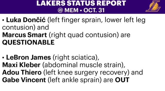 北京时间10月31日,湖人官方更新明日对阵灰熊的伤病报告,东契奇(左手指扭伤、左小腿挫伤)、斯马特(右侧股四头肌挫伤)的状态已经升级为出战成疑(50%可能出战)。詹姆斯(右侧坐骨神经痛)、克勒贝尔(腹部肌肉拉伤)、阿杜-蒂耶罗(左膝手术恢复)和文森特(左脚踝扭伤)继续缺阵。海斯已经不在伤病报告中,预计也可以出战灰熊。