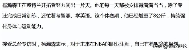 根据央视体育的报道,杨瀚森尽管缺席了男篮亚洲杯,但他在波特兰的每一天都被安排得满满当当,除了专注完成日常训练,还忙着考驾照、学英语。这个休赛期,他已经增重了8公斤,持续强化身体与运动能力。