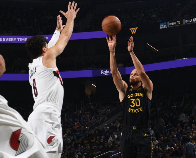 第二节,勇士开局波杰姆斯基连续得分,中段库里找回手感,通过挡拆小打大连续命中三分得分,带领球队打出一波进攻高潮确立领先。节末阶段,库里再中两记三分将分差扩大到9分。半场战罢,勇士单节轰出44-30的比分,以72-65反超开拓者。