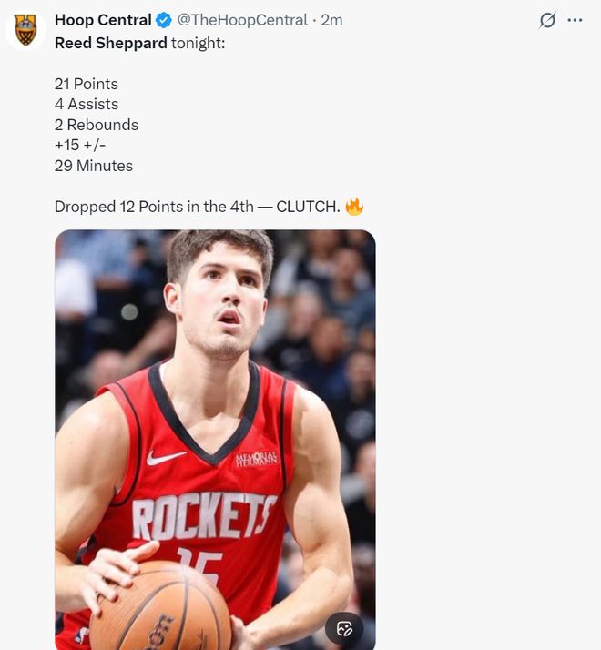 北京时间1月21日,NBA常规赛,火箭111-106逆转马刺拿到三连胜,这场比赛火箭一度落后马刺16分之多,可在末节里德-谢泼德大爆发,加上火箭的防守层级一些提升到Best级只让马刺单节拿到14分,火箭官方也晒出谢泼德末节12分的贡献鼓掌感谢。