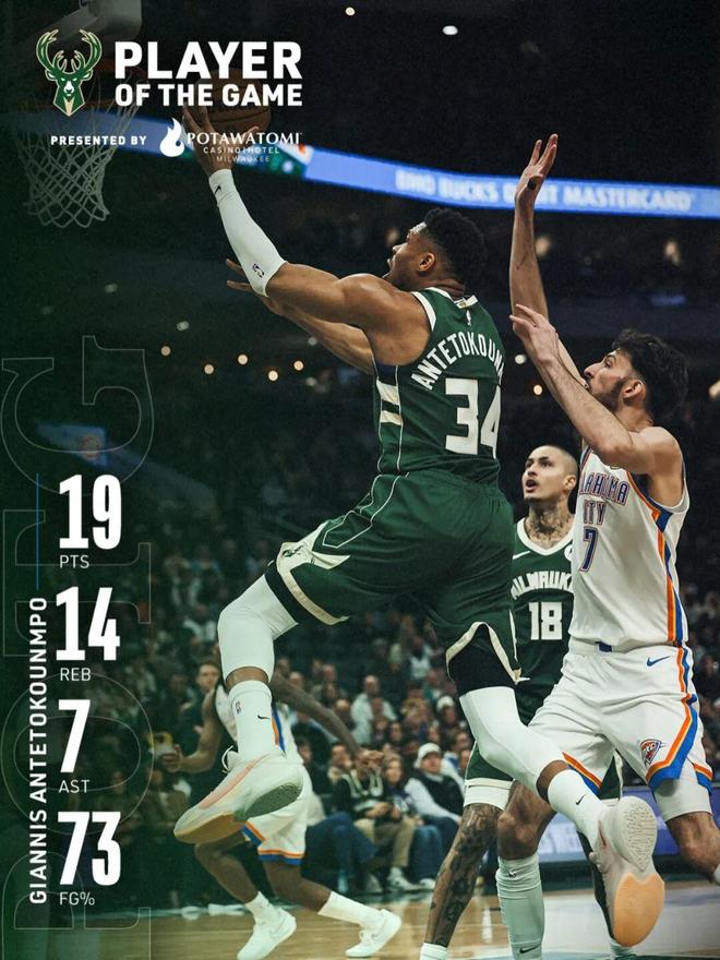 全场11次出手,是字母哥本赛季的最低出手数,单场19分也是他连续11场20+之后,第一次跌破这条得分红线。