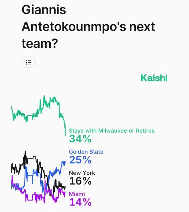 NBA常规赛还在如火如荼进行中,在巴特勒报销之后,勇士本赛季的争冠希望也跌入冰点。目前字母哥已经不愿意再继续留在雄鹿,也向球队提出了交易。只要提到字母哥换队,相信其余29队绝对都是有意的,他也是足够改变联盟决定改变联盟方向的球员。今天早些时候,某机构还更新了字母哥的下家概率,其中34%留在雄鹿,25%去勇士,16%尼克斯,14%热火,6%森林狼。