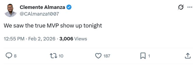 面对两人这样的表现,雷霆记者Clemente Almanza发文精准点评道:“我们看到了真正的MVP在今晚降临!”