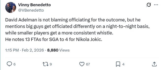 同时他指出本场比赛亚历山大一人拿到13次罚球,而约基奇仅为4次。
