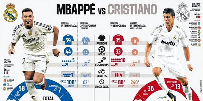 尽管C罗在皇马9年创造了无数纪录,但若单看两人加盟后的前两年表现(截至第二个赛季10月中旬),姆巴佩的数据竟显得更加亮眼: