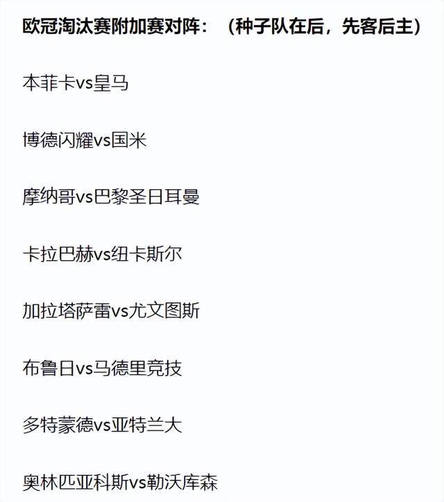 其他比赛,大巴黎遇到摩纳哥,纽卡斯尔面对卡拉巴赫,勒沃库森对阵奥林匹亚科斯,尤文抽到加拉塔萨雷,亚特兰大与多特上演焦点对决,马竞抽到了布鲁日,最终2回合踢完,将有8支球队进入16强,与已经晋级的8支球队,竞争本赛季欧冠冠军!