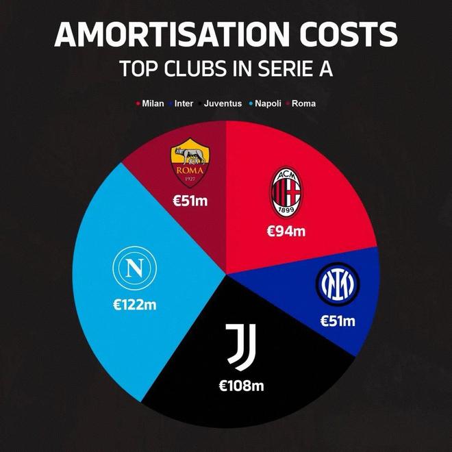意甲摊销成本最多的球队是那不勒斯,达到1.22亿欧元,他主要来源于近3个转会窗签下的布翁焦尔诺、麦克托米奈、卢卡库、内雷斯、比克马、诺阿朗等新援。第2名的尤文年摊销成本为1.08亿欧元,主要贡献者有库普梅纳斯、道格拉斯路易斯、小孔塞桑、冈萨雷斯等。国米的年摊销成本为5100万欧元,仅有米兰的54%,高投入引援有弗拉泰西、博尼等。