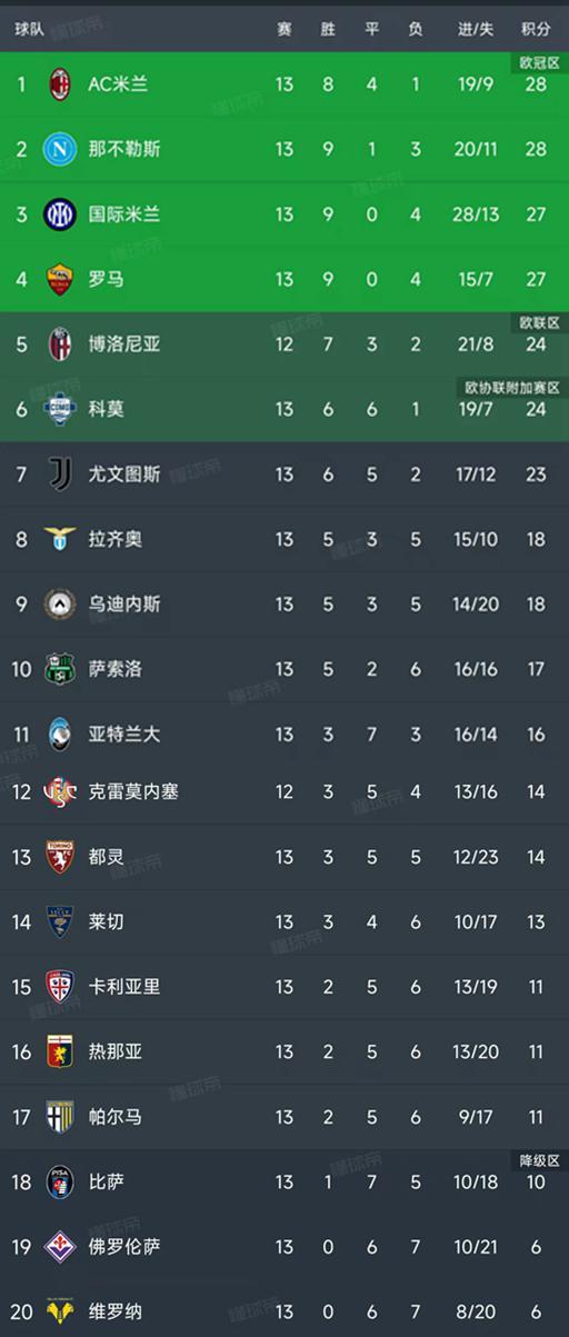 北京时间12月1日,意甲第13轮除了博洛尼亚和克雷莫内塞的比赛还没有进行,已经结束了9场较量,我们一起看看最新积分榜变动!