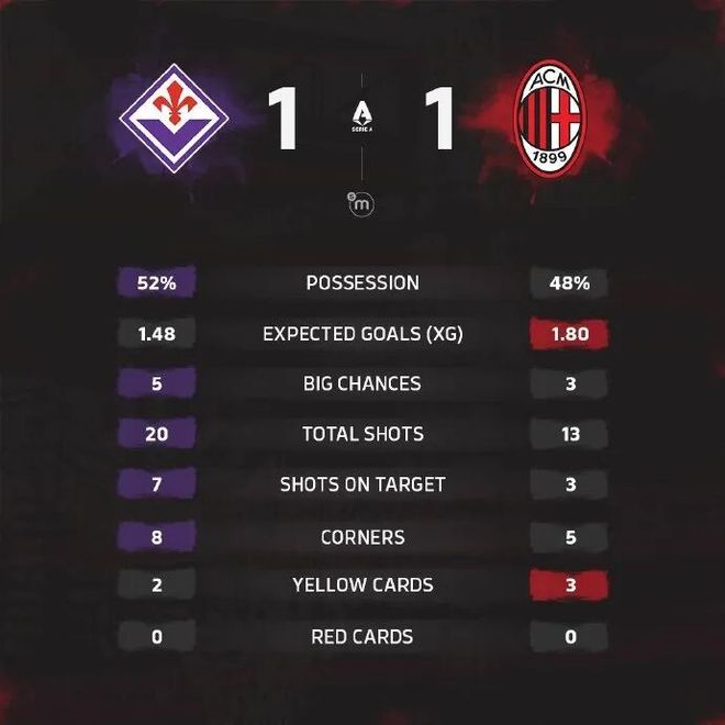 最终,米兰1-1战平佛罗伦萨。