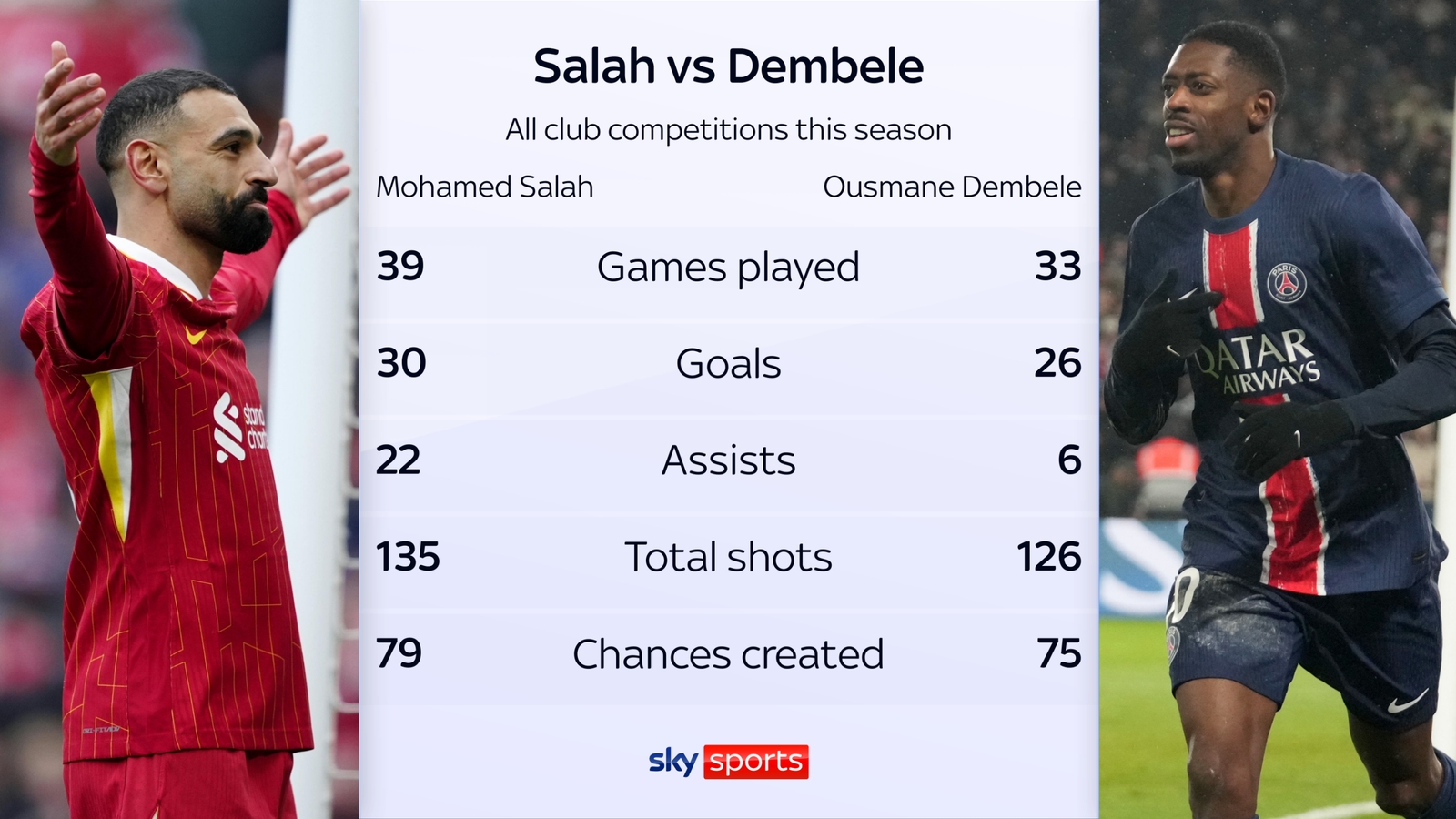 萨拉赫与登贝莱本赛季数据对比
