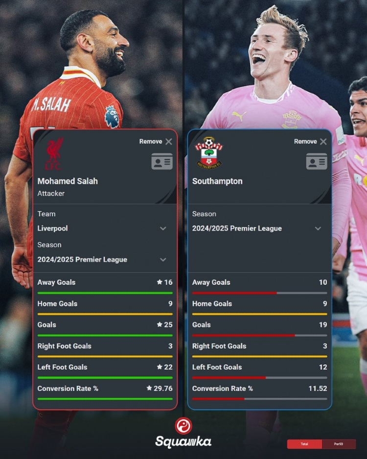 萨拉赫:25球,客场16球,主场9球,右脚3球,左脚22球,射门-进球转化率29.76%