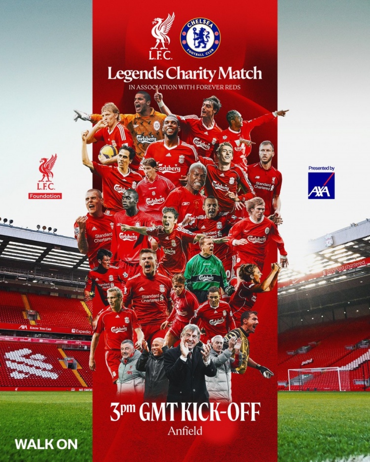 3月22日报道 利物浦传奇队将在安菲尔德的慈善赛中对阵切尔西传奇队,利物浦官方社媒晒出海报,预热这场比赛。