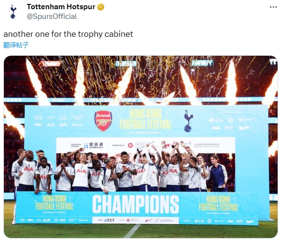 热刺官方赛后发文:奖杯陈列室冠军+1。上赛季热刺夺得欧联杯冠军,本月他们还将在欧超杯对阵巴黎。