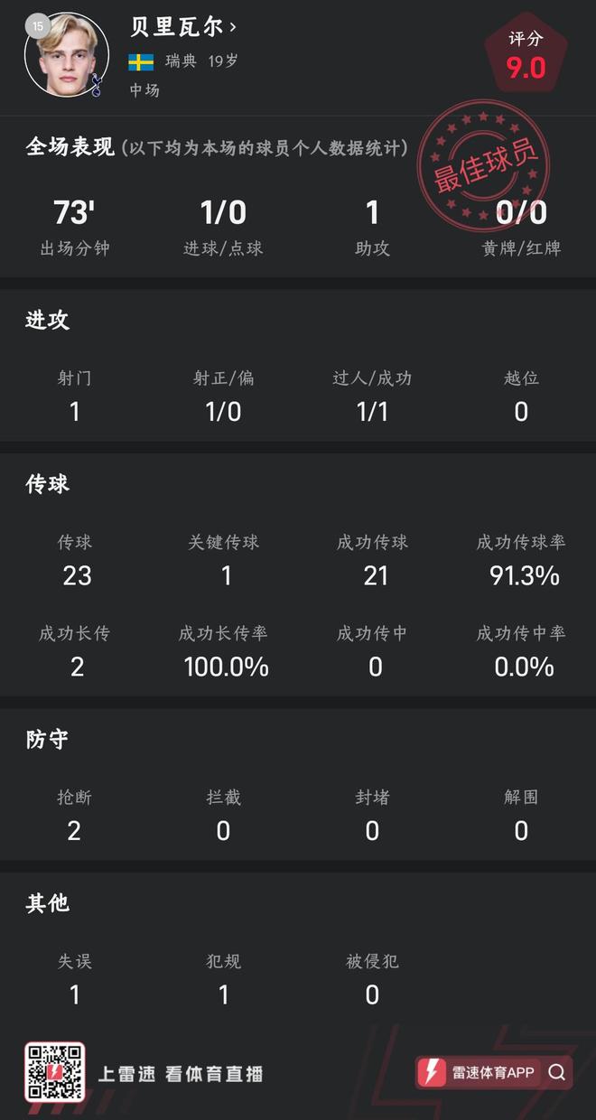 该场对决,贝里瓦尔出场73分钟,攻入1球且送出1次助攻。此外,贝里瓦尔全场23次传球其中21次成功,传球成功率高达91.3%;2次传中均成功。防守端,贝里瓦尔此役完成2次成功抢断。
