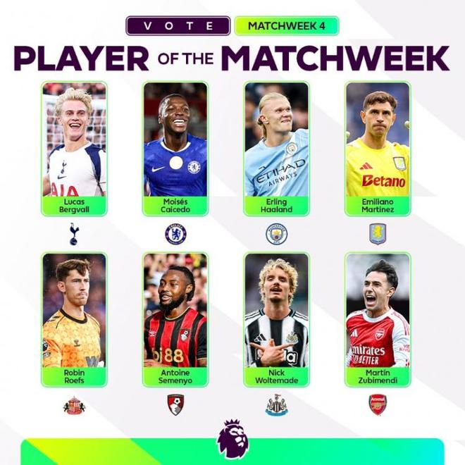 直播吧9月16日宣 英超第4轮战罢,联赛官方列本轮最佳球员候选,哈兰德、沃尔特马德、凯塞多、苏维门迪在列。