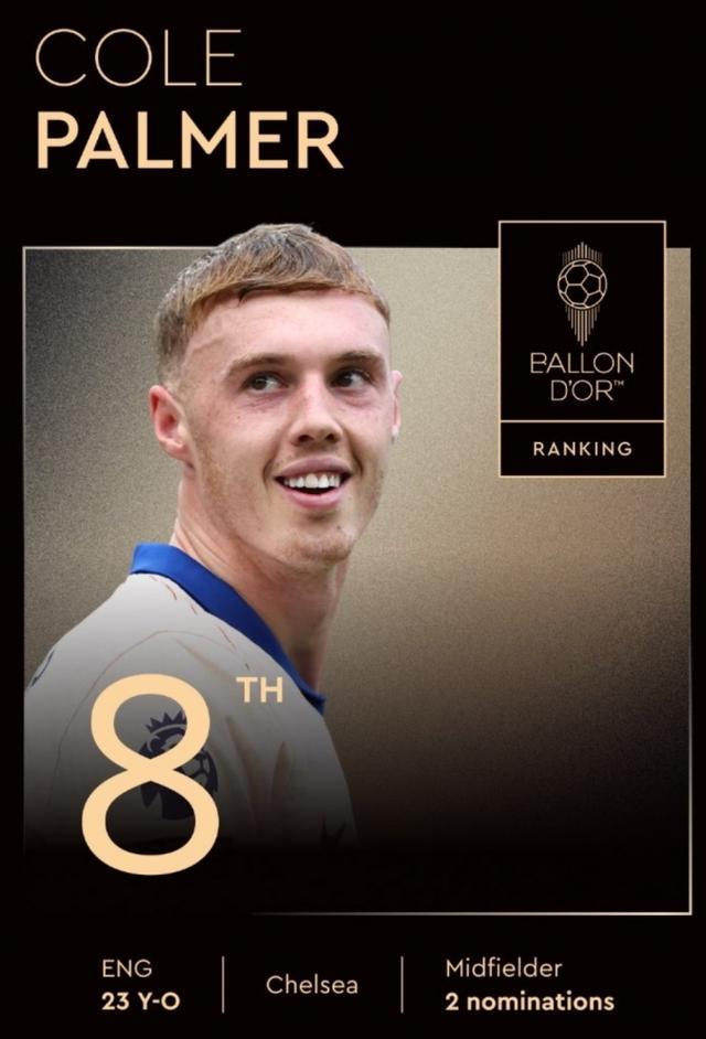 值得一提的是,切尔西全队只有帕尔默1人入选金球奖前30名。