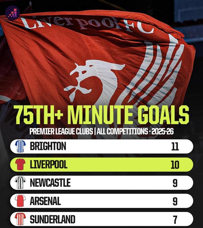 Opta列出了本赛季英超球队各项赛事第75分钟后进球榜,布莱顿11球居首,利物浦10球位列第二。