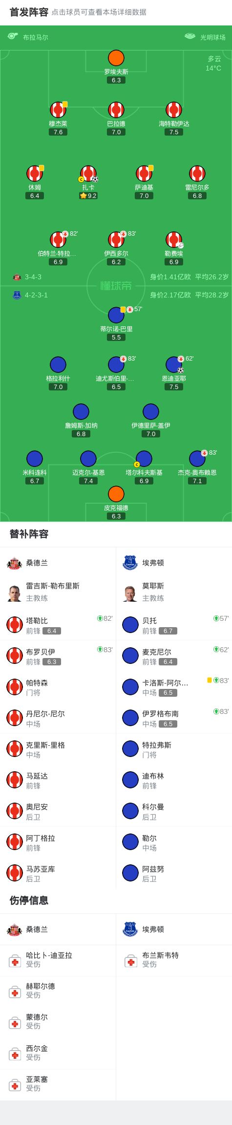 第46分钟,勒费埃回传,扎卡弧顶处低射破门扳平比分,桑德兰1-1埃弗顿