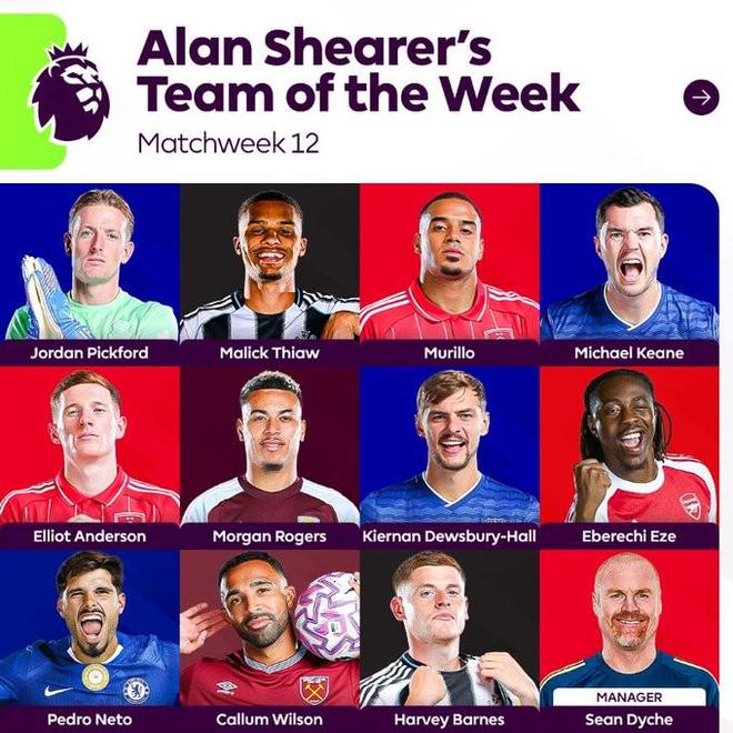 英超官方发布了阿兰-希勒评选的第12轮最佳阵容,埃泽领衔,内托、皮克福德等人在列。