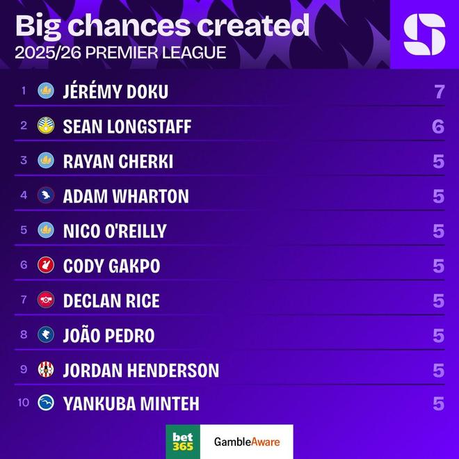 Squawka统计本赛季至今英超创造绝佳机会TOP10: