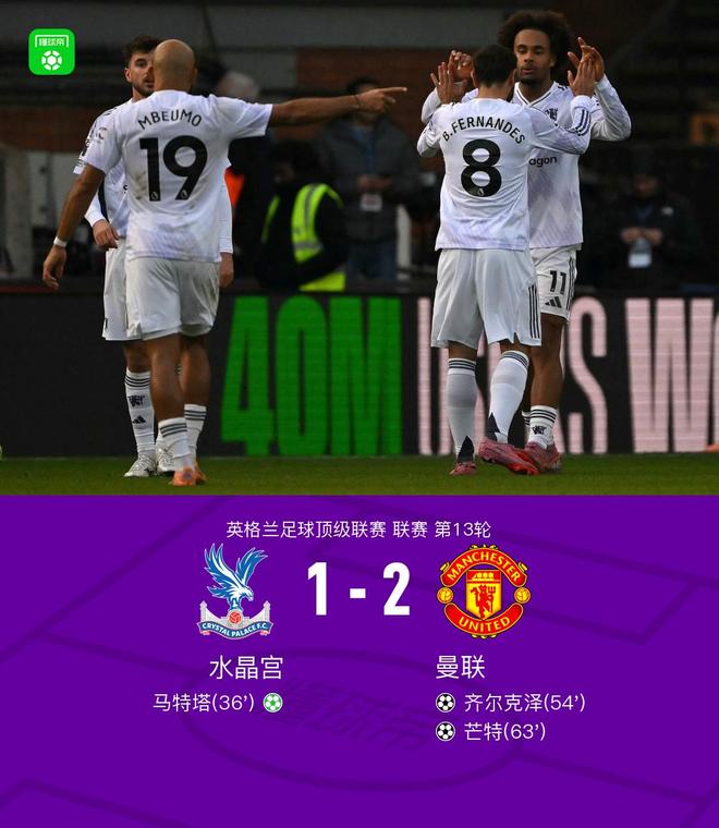 北京时间11月30日英格兰足球顶级联赛第13轮,水晶宫主场对阵曼联。上半场马特塔点球二触重罚破门。下半场,B费助攻梅开二度,先后助攻齐尔克泽、芒特破门。最终比分曼联2-1逆转水晶宫。