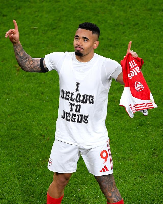 进球之后,热苏斯露出自己球衣里的内衬,而他球衣内衬上同样写着“I belong to Jesus”,不禁让人联想到米兰传奇卡卡当年标志性的庆祝动作。而热苏斯的名字更让这句话有了“一语双关”的意味。