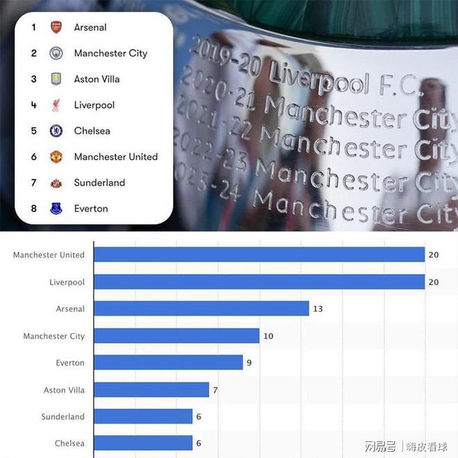 有统计表明,从1992赛季开始,英超正式成立,包括此前的英甲,获得顶级联赛冠军次数最多的,分别是曼联和利物浦,都是20次夺冠。随后是阿森纳的13次,曼城的10次。不到10次的球队,还有埃弗顿(9次),阿斯顿维拉(7次),桑德兰(6次)和切尔西(6次)。