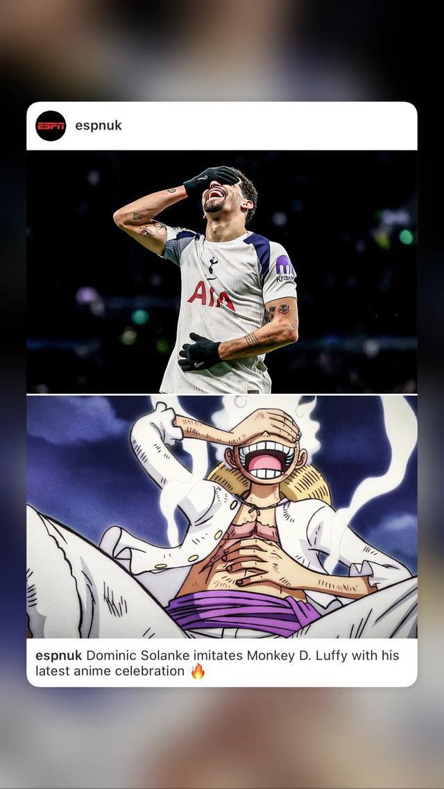 在解释这个庆祝动作时,索兰克表示:“是这样的,我们家又要迎来一个新成员了,我的妻子正在怀孕。所以这个进球我想献给她。我加入了一个小小的动漫庆祝。我知道很多人都在等待我复出后的第一个进球,那个动作来自《海贼王》,这是我最喜欢的动漫之一,是路飞的一个动作。”同时索兰克在快拍中将路飞P上了热刺的球衣。