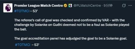 而英超官方也宣布,索兰克对格伊的接触不构成犯规,因为前者碰到了球。进球认证小组已经判定该进球是索兰克的进球。