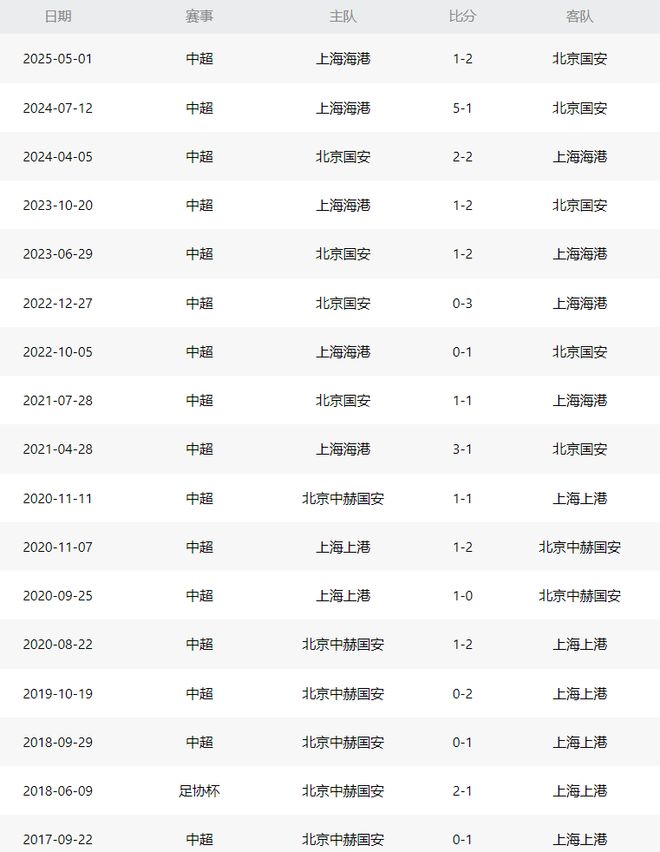 据统计,北京国安在中超主场面对上海海港已经很久没有取胜过,上一次还是2016年,随后8年连续不胜,战绩为2平6负,输过0-3、0-2、1-2、0-1的各种比分,创造主场不胜耻辱纪录。