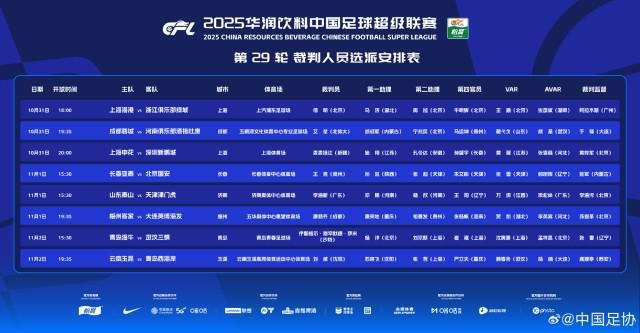 中超第29轮将在本周五至周日打响。中国足协公布了本轮裁判安排。傅明执法上海海港VS浙江队;沙特籍裁判伊斯梅尔·穆罕默德·萨米执法青岛海牛VS武汉三镇。
